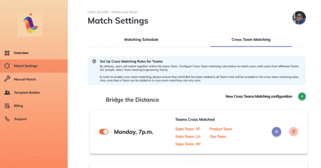 - Virtual coffee & donut meet-ups: LEAD.bot (integrated within platforms like Slack or Microsoft Teams) makes it simple to meet new “coffee pals” virtually.