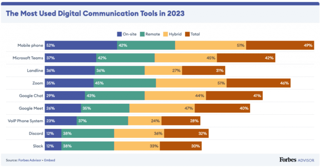 While on-site workers lean towards mobile phones (38%) and Zoom (21%) for communication, remote and hybrid workers display a diverse preference. Remote workers favor both Zoom and Google Chat (22% each), while hybrid workers lean towards Zoom (31%) and Google Meet (23%).