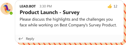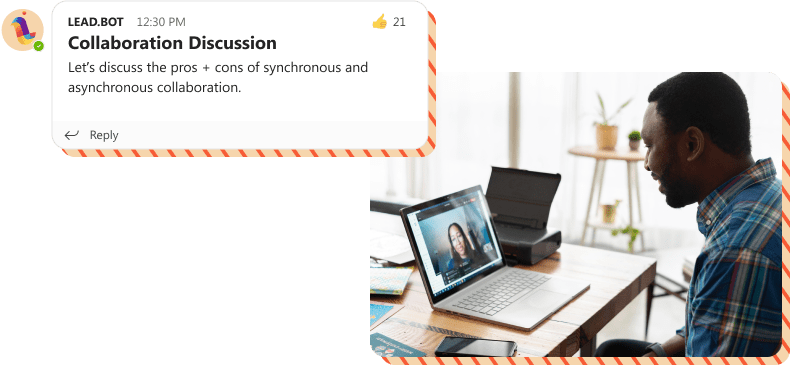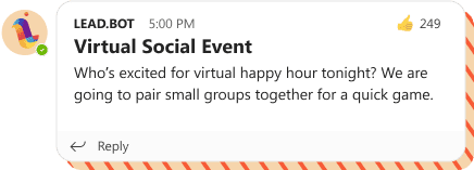 An all-remote or hybrid work environment can cause teams to feel disjointed – affecting company-wide culture, communications, and efficiency. Bridge teams together by fostering trust, collaboration, and community between remote and hybrid teams by implementing Lead.bot.
