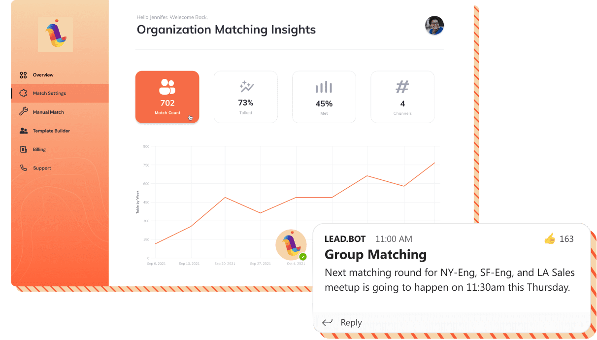 LEAD.bot leverages relationship intelligence, real-time collaboration, and AI to reveal hidden communication channels and highlight potential leadership within the organization. It fosters employee engagement through virtual coffee chats and watercooler sessions, seamlessly integrating new hires and coaching new managers.