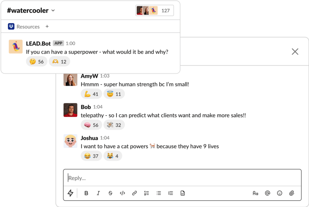 - Cultural Integration: LEAD.bot’s Viture Watercooler chats create spaces for employees to connect, share experiences, and build relationships, bridging cultural gaps and fostering a unified workforce.