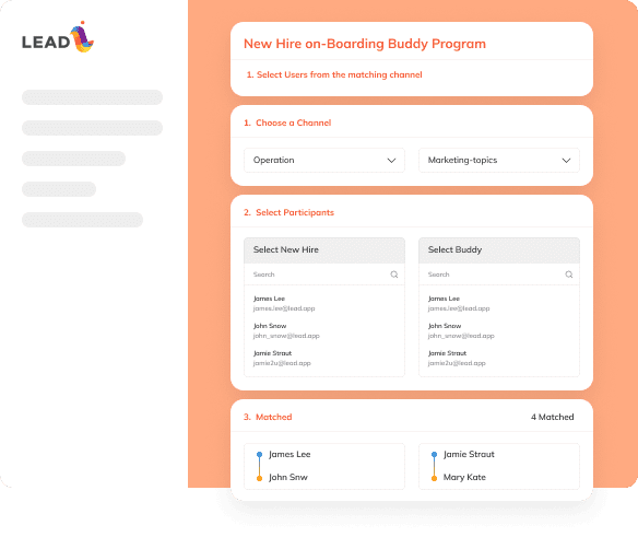 Building relationships between employees from different organizations is a critical step in creating a unified culture during M&A. LEAD.bot’s matching algorithms offer a structured solution to foster these connections by pairing employees from both entities for meaningful interactions. For example, employees can be matched for one-on-one conversations or collaborative projects, enabling them to share insights, align on goals, and build trust. These cross-team connections help break down silos and promote collaboration, ensuring that employees feel integrated into the new organization.