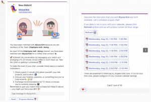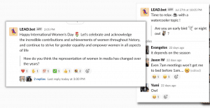 LEAD.bot’s coffee chat feature is designed to facilitate virtual social interactions, recreating the informal, spontaneous conversations usually found in office settings like coffee breaks or watercooler chats. It’s compatible with platforms like Slack and Microsoft Teams, automating the pairing of colleagues for these virtual meet-ups. This feature aims to lower stress, increase camaraderie, and improve overall employee wellbeing and productivity by encouraging regular, informal communication among team members. Admins have the flexibility to customize their interaction schedule, and LEAD.bot takes care of the rest, including automate scheduling with calendar integration, that helps in organizing coffee meet-ups by automatically finding time slots that suit everyone.