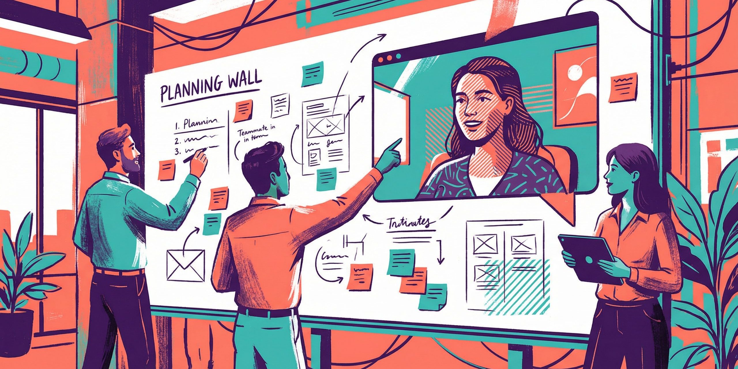 Editorial illustration of remote coworkers enjoying a lively virtual coffee break together.