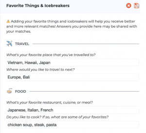 4.Favorite Things & Icebreakers: Share your favorite movies, foods, hobbies, etc. These details can make initial conversations more engaging and less formal. By creating lists of their 🌟 Favorite Things, teammates can easily find shared interests, hobbies, learn about each other’s favorite movies, foods, music, and more. Allow participants to learn more about each other before they meet up.