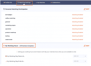 6. Edit Personal Matching Information: You can edit your personal matching information, including settings to enable or disable the next matching round when you are out of the office or on vacation. You can also view the history of your matches, providing insights into your past connections