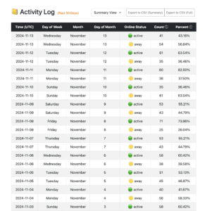 In this example, after a month of evaluation, we can see that this user works over a longer period than the traditional 9-to-5 in their local timezone, with frequent breaks in between. This pattern is common and often reflects responsibilities such as family needs throughout the day.