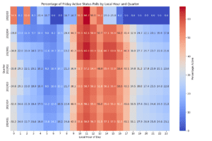 When we break down activity by both day and hour, clear patterns emerge across the workweek: