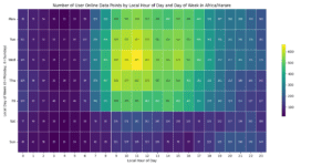 In Harare, Zimbabwe’s capital, work hours are less clearly defined. Late into the night, there is about half or a third of the activity seen during peak hours. However, the sample size for this location was smaller, making it harder to draw definitive conclusions.