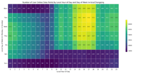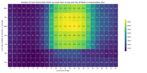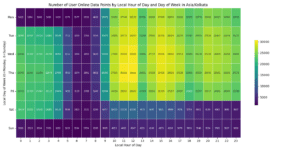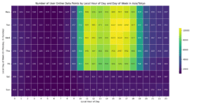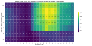 In Kolkata, India’s third-largest city, we observe what appears to be strong overlap with North American timezones. There is no clear peak activity on the heatmap, suggesting that workers may be working longer hours or that the evening and daytime shifts are similarly active. (Note: Heatmaps show activity but don’t reveal the number of hours worked or the number of users at any given point, which we’ll investigate separately.)