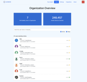For organizations with members who frequently travel—like consultants or globally distributed teams—real-time snapshots of time zones ensure smoother collaboration and help teams schedule meetings at times that work for everyone. Instead of micro-managing hours worked, Sunrize focuses on optimizing teamwide collaboration and supporting employees’ flexibility in how they work best.